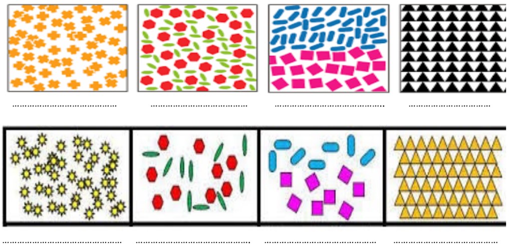 Choisir les noms de ces légendes parmi : corps pur ; mélange homogène ; mélange hétérogène