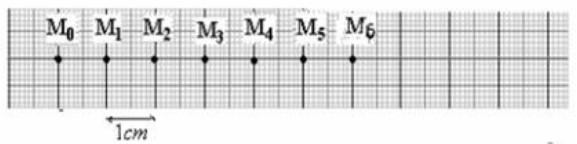 On lâche un mobile autoporteur sur une table inclinée et on enregistre les positions successives d’un point M de ce mobile. Entre deux positions enregistrées, il s’est écoulé une durée \( \tau = 40 \, \text{ms} \).