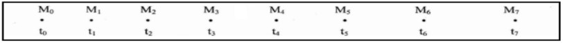On donne l’enregistrement du mouvement d’un mobile M pendant des intervalles de temps successifs et égaux : \( \tau = 30 \, \text{ms} \).