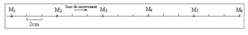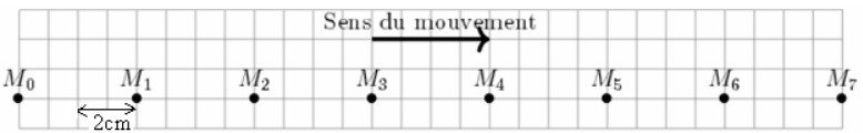 On donne l’enregistrement du mouvement d’un mobile M pendant des intervalles de temps successifs et égaux : \( \tau = 50 \, \text{ms} \)