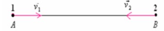Deux voitures se déplacent sur une route rectiligne dans deux sens contraires avec des vitesses \( \vec{v}_1 \) et \( \vec{v}_2 \).