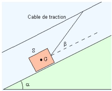 Un solide de masse \( m = 5 \text{kg} \), glisse sans frottement sur un plan incliné d’angle \( \alpha = 15^\circ \) par rapport à l’horizontale. Il est entraîné à vitesse constante par un câble faisant un angle \( \beta = 20^\circ \) avec la ligne de plus grande pente du plan incliné.