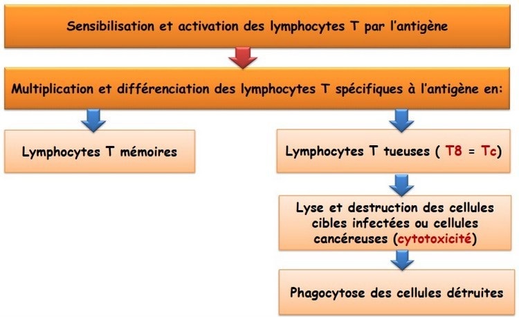 Dans le cas des bactéries intracellulaires (ex: bacille de Koch, les virus et les cellules cancéreuses (tumorales)), le système immunitaire intervient par une autre voie : c’est la réponse immunitaire à médiation cellulaire. C’est une réaction lente et spécifique qui consiste à sensibiliser et activer les lymphocytes T ; certaines deviennent des cellules tueuses (cytotoxiques) qui détruisent directement les cellules infectées et les cellules cancéreuses, d’autres deviennent des cellules mémoires.