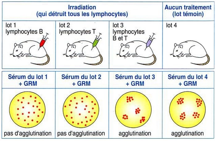 Interprétations des résultats : L’expérience de Mosier montre que la réponse immunitaire spécifique humorale ne peut avoir lieu qu’en présence des macrophages, des lymphocytes T et des lymphocytes B, en plus de l’antigène (Globules Rouges du Mouton = GRM). En absence des macrophages, des lymphocytes T ou des lymphocytes B, la réponse immunitaire ne peut pas avoir lieu (pas de production d’anticorps anti-GRM).