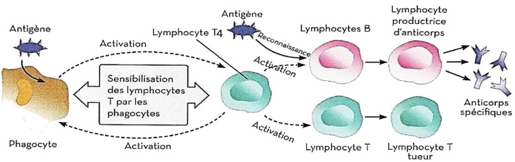 Le macrophage phagocyte l’antigène, le présente aux lymphocytes T helper (CD4+), ceux-ci activent les lymphocytes B (production d’anticorps) et les lymphocytes T cytotoxiques (CD8+) qui détruisent les cellules infectées.