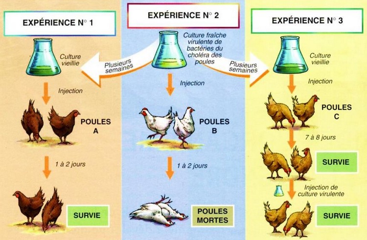 - Décris l’expérience 1 et ses résultats : injection de culture vieillie (atténuée) → les poules survivent. Les bactéries issues d’une culture vieillie ne sont pas pathogènes (atténuées).