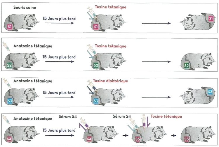 – S5 survit grâce à l’injection du sérum qui contient des anticorps provenant de S4 guérie du tétanos.