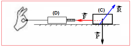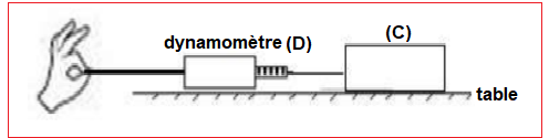 Sur une table horizontale, on place un corps (C) sur lequel on exerce une force \( \vec{F} \) à l’aide d’un dynamomètre (D), comme l’indique la figure.