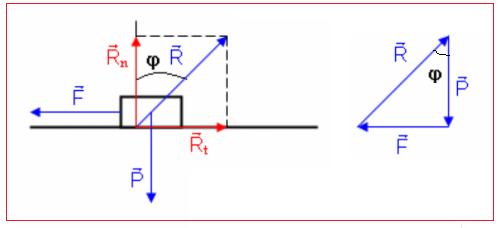 On constate que la réaction \( \vec{R} \) exercée par la table n’est pas perpendiculaire à la surface de contact, elle forme un angle \( \varphi \) avec la normale qu’on appelle angle de frottement.