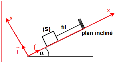 Un solide (S) est attaché à un fil inextensible sur un plan incliné faisant un angle \( \alpha \) avec l’horizontale (voir figure).