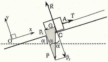 – Le solide (S) est en équilibre on écrit : \( \vec{R} + \vec{T} + \vec{P} = 0 \)