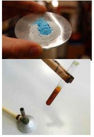 - De l’eau : On utilise un réactif : Le sulfate de cuivre II anhydre de couleur blanche qui devient bleu en présence de l’eau.