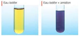 - De l’amidon : On utilise un réactif : L’eau iodée de couleur jaune qui devient bleue – nuit en présence de l’amidon.