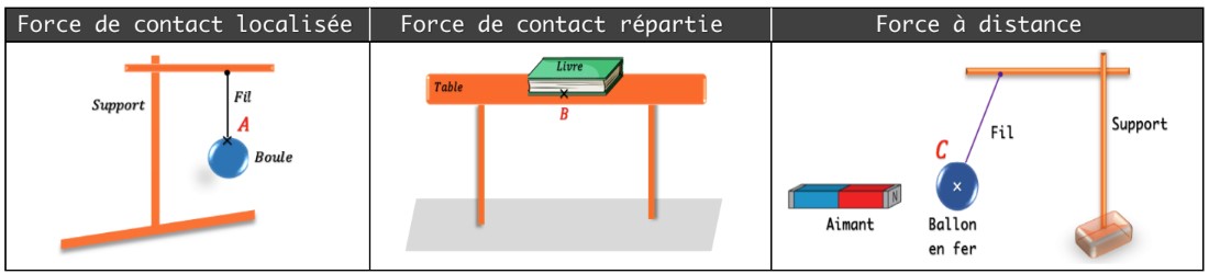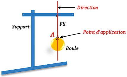 Exemple : Dans l’exemple 1 le fil exerce une force sur la boule. Le sens de la force est : du point A vers le haut.