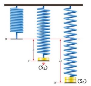 On observe que l’allongement du ressort est plus grand lorsqu’on a accroché une masse plus grande. La force exercée par le corps S₂ est plus grande que celle exercée par le corps S₁.