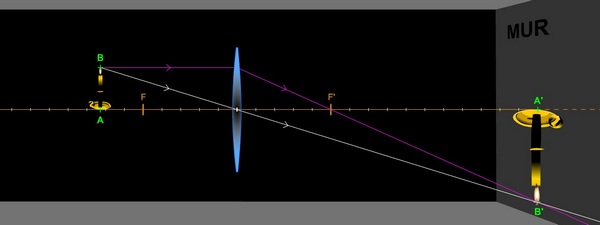 On observe une image nette sur l’écran (mur) pour une seule position de l’écran, et cette image est renversée. L’image d’un point A sur l’axe optique est un point A’ sur le même axe. L’image d’un point B est obtenue par l’intersection de deux rayons : un rayon incident parallèle à l’axe optique et émerge en passant par le foyer image F’, et un rayon passant par le centre optique n’est pas dévié.