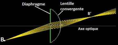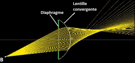 On projette un faisceau lumineux sur une lentille convergente munie d’un diaphragme, en laissant l’ouverture du diaphragme ouverte.