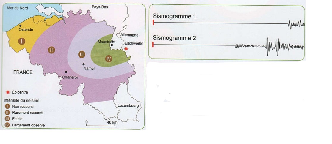 Le document (b – à droite) donne deux sismogrammes enregistrés dans deux stations du réseau sismique belge. L’une est située à 89km de l’épicentre; l’autre à 168km de l’épicentre.