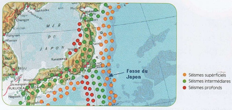 Le document ci-dessous montre la répartition des foyers des séismes à l’ouest de la fosse du Japon.