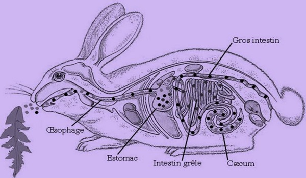 Le lapin possède un tube digestif long et développé formé d’un petit œsophage, d’un grand estomac, et d’un long intestin grêle.