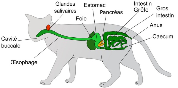 Les aliments dont se nourrit le chat s’acheminent dans un tube digestif court et simple constitué par un large œsophage qui conduit à un petit estomac, puis à un court intestin grêle pour finir dans le gros intestin trois fois plus long que le corps.