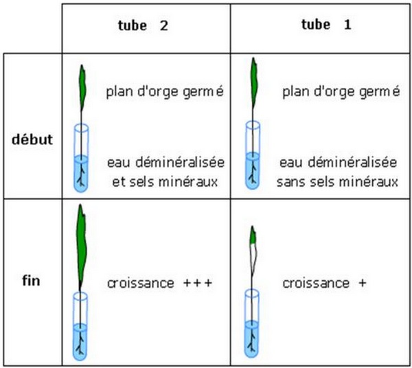 - Tube 1: on donne de l’eau déminéralisée (sans sels minéraux) à la plante expérimentale.