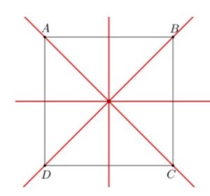 Les axes de symétrie d’un carré sont ses diagonales et les médiatrices de ses côtés.