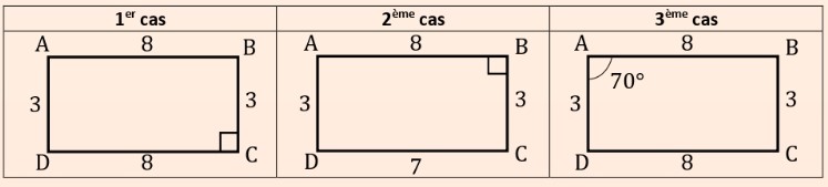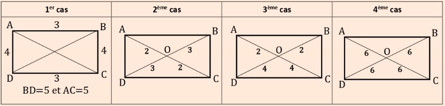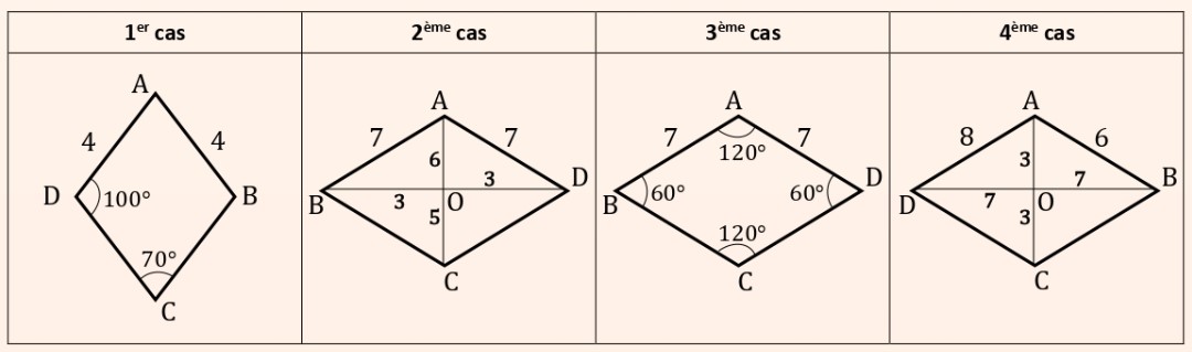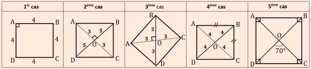 Quadrilatères particuliers – exercices corrigés Quadrilatères particuliers – exercices corrigés Cours Évaluations corrigés 📐Exercice 1 :Considérons la figure suivante : Répondre par « Vrai » ou « Faux » : ParallélogrammeRectangleLosangeCarré 📝 Correction de l’exercice 1 ▶️ Correction en vidéo 📝 Correction de l’exercice 1 ParallélogrammeRectangleLosangeCarré1FauxFauxFauxFaux2VraiVraiVraiVrai3VraiFauxVraiFaux4VraiVraiFauxFaux ▶️ Correction en vidéo 📐Exercice 2 :En justifiant votre réponse, déterminer dans chacun des cas suivants si le quadrilatère ABCD est un rectangle ou non : 🔒 Abonnez-vous pour accéder à la correction détaillée en texte et en vidéo. Je m’abonne maintenant 📐Exercice 3 :En justifiant votre réponse, déterminer dans chacun des cas suivants si le quadrilatère ABCD est un rectangle ou non : 🔒 Abonnez-vous pour accéder à la correction détaillée en texte et en vidéo. Je m’abonne maintenant 📐Exercice 4 :Construire un rectangle EFGH tel que FH = 6 cm.Indications :FH est une diagonale du rectangle EFGH. Dans un rectangle, les diagonales sont égales et se coupent en leur milieu. 🔒 Abonnez-vous pour accéder à la correction détaillée en texte et en vidéo. Je m’abonne maintenant 📐Exercice 5 :En justifiant votre réponse, déterminer dans chacun des cas suivants si le quadrilatère ABCD est un losange ou non : 🔒 Abonnez-vous pour accéder à la correction détaillée en texte et en vidéo. Je m’abonne maintenant 📐Exercice 6 :En justifiant votre réponse, déterminer dans chacun des cas suivants si le quadrilatère ABCD est un carré ou non ? 🔒 Abonnez-vous pour accéder à la correction détaillée en texte et en vidéo. Je m’abonne maintenant 📐Exercice 7 :Construire un carré MNPK de diagonale MP = 5 cm.Indications :MP est une diagonale du carré MNPK. Dans un carré, les diagonales sont égales, perpendiculaires et se coupent en leur milieu. 🔒 Abonnez-vous pour accéder à la correction détaillée en texte et en vidéo. Je m’abonne maintenant 📐Exercice 8 :Soit \( (C) \) un cercle de centre \( O \).Montrer que \( EFGH \) est un rectangle. 🔒 Abonnez-vous pour accéder à la correction détaillée en texte et en vidéo. Je m’abonne maintenant 📐Exercice 9 :Soit DEF un triangle tel que \( \widehat{DEF} = 30^\circ \) et \( \widehat{EFD} = 60^\circ \).1) Construire G et H les symétriques respectifs des points E et F par rapport à D.2) Montrer que EFGH est un losange.Rappel :Le symétrique d’un point M par rapport à un point D est le point M’ tel que D soit le milieu du segment [MM’]. 🔒 Abonnez-vous pour accéder à la correction détaillée en texte et en vidéo. Je m’abonne maintenant 📐Exercice 10 :Voir la figure suivante, telle que \( \widehat{ABC} = 90^\circ \).Montrer que ABCD est un carré. 🔒 Abonnez-vous pour accéder à la correction détaillée en texte et en vidéo. Je m’abonne maintenant 📐Exercice 11 :Soit [AB] un segment et soit (MK) la médiatrice de [AB] telle que K est le milieu de [AB].1)a- Construire C et D les symétriques respectifs de A et B par rapport à M.b- Montrer que ABCD est un rectangle.2)a- Construire H le symétrique de M par rapport au point K.b- Montrer que AMBH est un losange. 🔒 Abonnez-vous pour accéder à la correction détaillée en texte et en vidéo. Je m’abonne maintenant 📐Exercice 12 :1) Construire des points A, B, C, D, E, F tels que ABCD et BCFE sont deux carrés.2)a- Montrer que D, C, F sont alignés.b- Montrer que (BD) ⊥ (BF).3)a- Construire N le symétrique de B par rapport au point C.b- Montrer que BDNF est un carré. 🔒 Abonnez-vous pour accéder à la correction détaillée en texte et en vidéo. Je m’abonne maintenant 📐Exercice 13 :Considérons la figure suivante telle que ABCD est un parallélogramme et \( (C) \) est un cercle de diamètre \([BD]\).Montrer que MDNB est un rectangle. 🔒 Abonnez-vous pour accéder à la correction détaillée en texte et en vidéo. Je m’abonne maintenant 📐Exercice 14 :Considérons la figure suivante telle que :ABCD est un carré.(EF) et (GH) sont perpendiculaires à (BD).(FG) et (EH) sont perpendiculaires à (AC).1) Montrer que EFGH est un parallélogramme.2) Montrer que EFGH est un rectangle.3) a- Montrer que EACF et EBDH sont deux parallélogrammes. b- En déduire que EFGH est un carré. 🔒 Abonnez-vous pour accéder à la correction détaillée en texte et en vidéo. Je m’abonne maintenant Quadrilatères particuliers – exercices corrigés