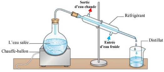 – La distillation permet de séparer les constituants d’un mélange homogène en réalise une vaporisation suivie d’une liquéfaction. Le liquide obtenu s’appelle l’eau distillée (distillat).