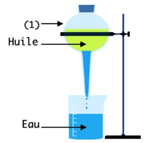 – On fait couler l’eau dans le bécher jusqu’à la limite de séparation des liquides. L’huile reste dans l’ampoule à décanter.