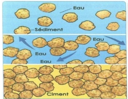 Déduire les deux étapes qui permettent de passer de débris rocheux (sable et particule argileuse) à une roche cohérente (1 pt)