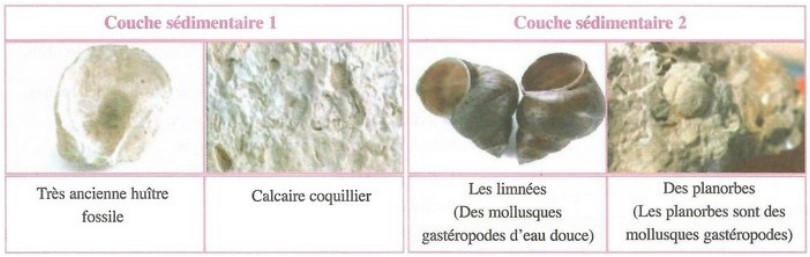 Au niveau d’une carrière, des études paléontologiques ont permis d’identifier deux couches sédimentaires avec le contenu fossilifère ci-dessous :
