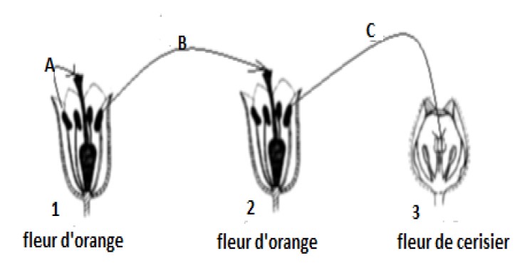 B- Le document ci-dessous représente l’opération de la pollinisation entre trois fleurs