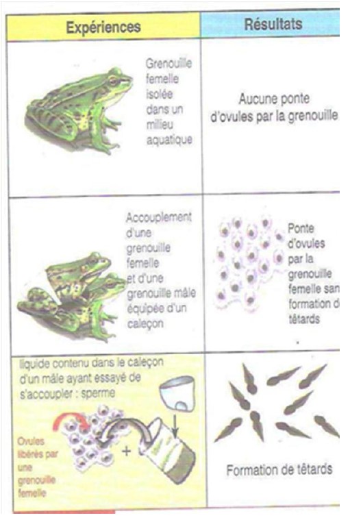 Pour mettre en évidence le rôle du mâle et de la femelle dans la reproduction chez les animaux, Spallanzani a réalisé les expériences du document 3 sur les grenouilles.