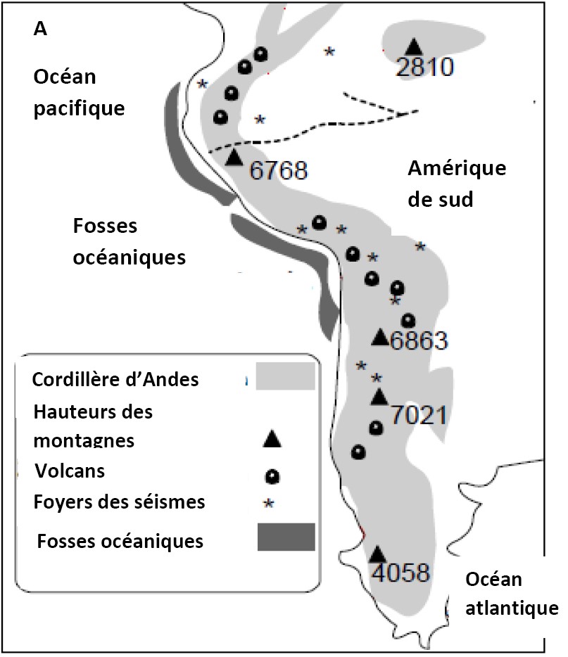 Les chaînes de montagnes d’Andes se situent dans une zone de convergence entre deux plaques la plaque pacifique et celle de l’Amérique du sud. La limite entre ces deux plaques est marquée par plusieurs évènements importants et de structures géologiques marquantes, illustrés dans les documents A et B.