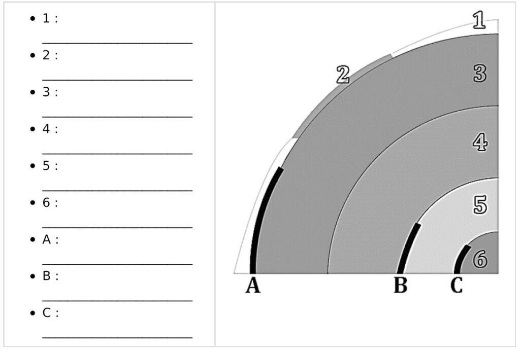 Croûte continentale – Croûte océanique – Noyau externe – Manteau inférieur – Moho – Manteau supérieur – Discontinuité de Gutenberg – Noyau interne – Discontinuité de Lehman