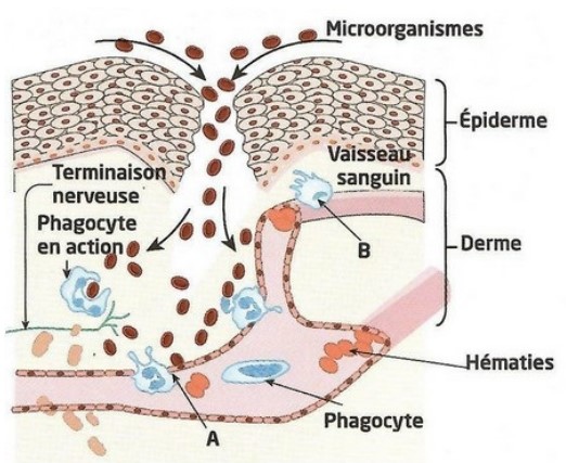 Lorsque l’on se blesse, des microbes peuvent pénétrer dans la plaie. À l’endroit de la plaie, l’organisme réagit, il se produit une inflammation locale ou réaction inflammatoire :