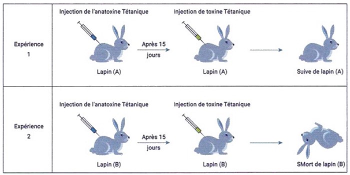 4. A partir des données du document, expliquer les résultats des deux expériences (1) et (2) (survie du lapin (A) et la mort du lapin (B).