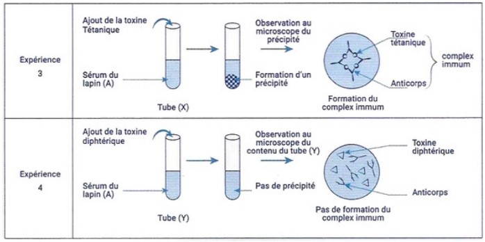 Afin de comprendre les résultats des expériences (1) et (2), on isole le sérum du sang du lapin (A) qui est resté en vie et on le met dans deux tubes (x) et (y). On ajoute la toxine tétanique au tube (x) et la toxine diphtérique au tube (y).