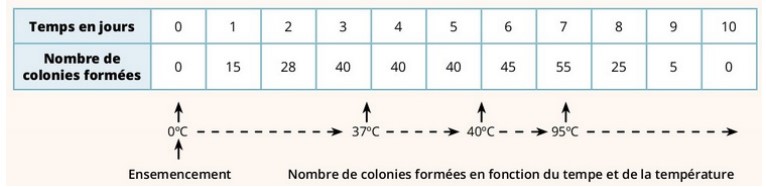 Pour connaître l’effet de la température sur le développement d’une bactérie pathogène, un microbiologiste réalise l’expérience suivante : Des températures variables de façon successive: 0°C, 37°C, 40°C et 95°C. L’expérience a duré 10 jours et le microbiologiste a contrôlé quotidiennement le développement de la bactérie en relevant le nombre de colonies formées. Les résultats sont consignés dans le tableau suivant :
