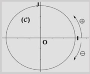 On appelle cercle trigonométrique le cercle de centre O et de rayon 1 orienté dans le sens antihoraire (aussi appelé sens direct ou sens positif).