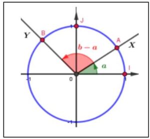 Soit \( [OX) \) et \( [OY) \) deux demi-droites d’origine O et soit \( C \) le cercle trigonométrique de centre O. Soient \( A(a) \) et \( B(b) \) les points d’intersections de \( C \) avec les demi-droites \( [OX) \) et \( [OY) \) respectivement.